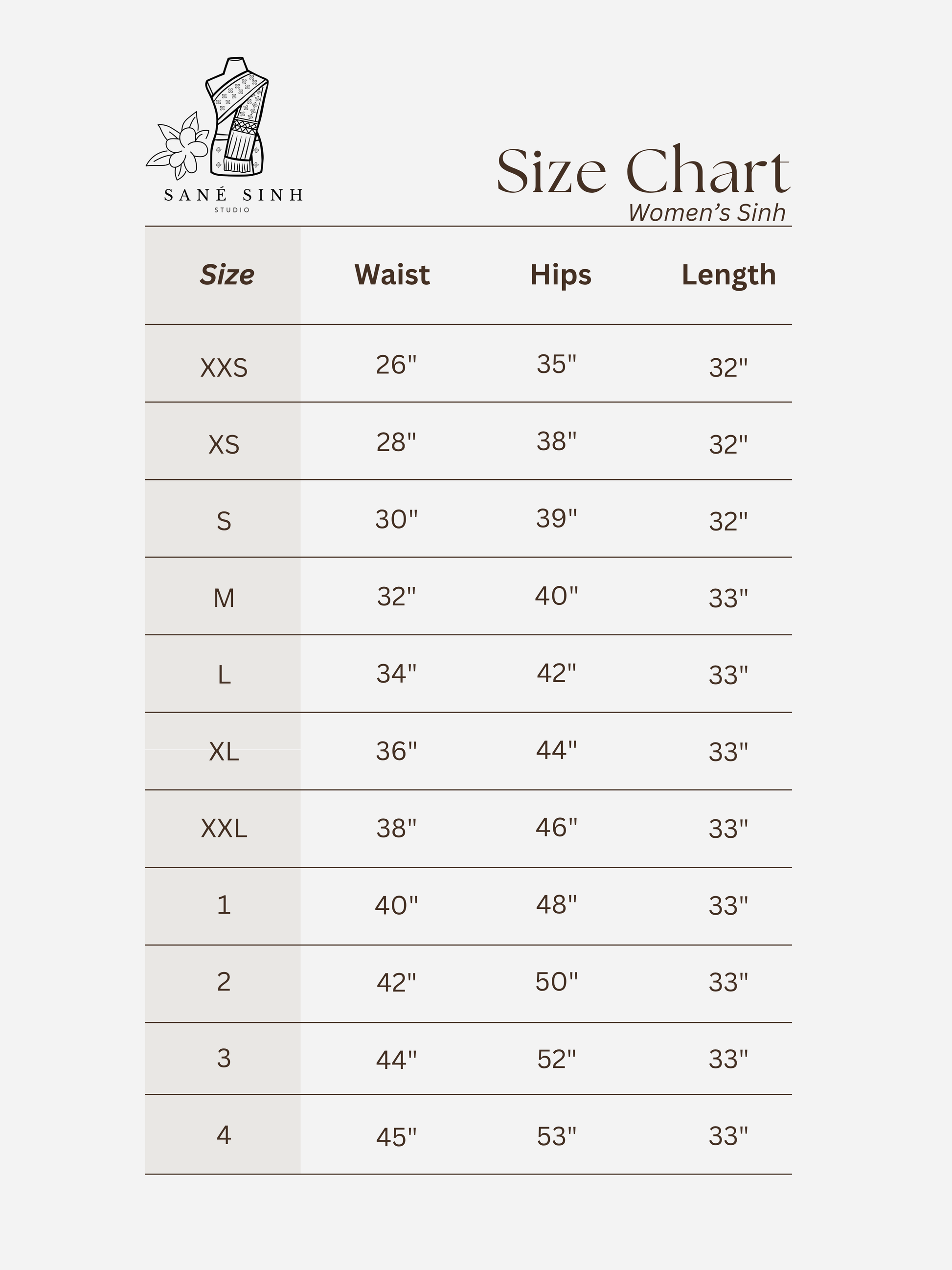 Soft synthetic Lao silk blend. Pre-pleated for easy wear — no wrapping, no pinning. Just match your waist size and go.