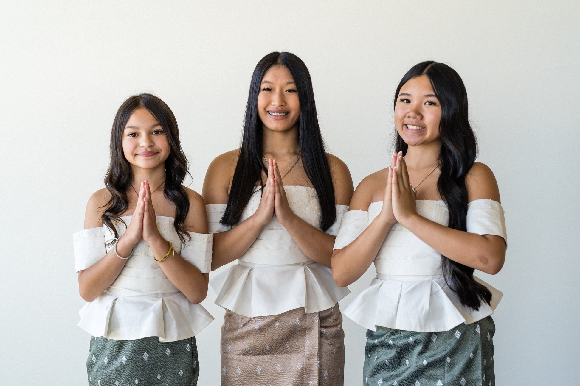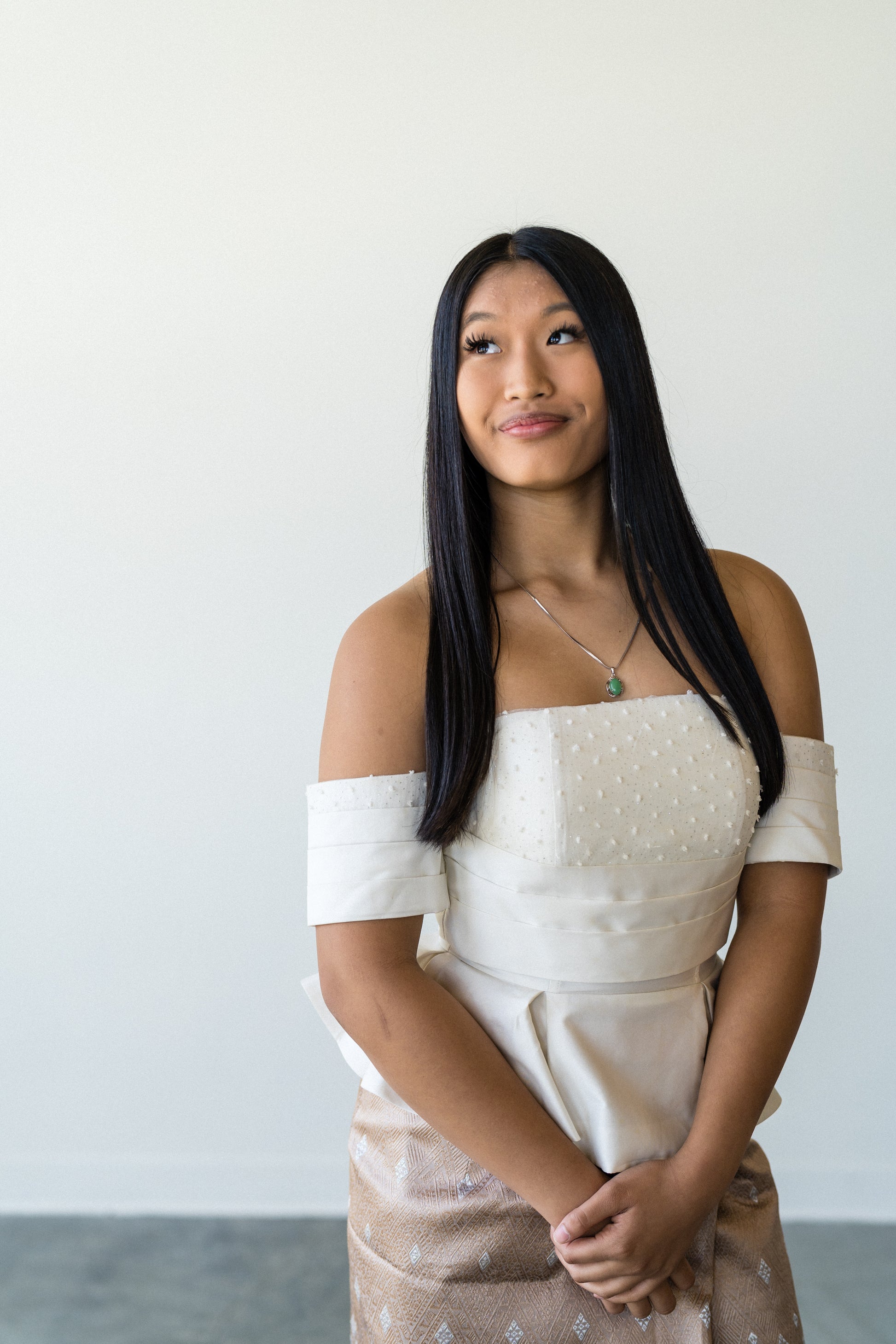 These handmade Lao-inspired tops blend traditional elegance with a fresh modern twist. Designed in a flattering off-shoulder cut with a peplum waist, they pair beautifully with a sinh or dress pants. The subtle sparkle on the bodice adds just enough shine — perfect for special events, family photos, or just feeling cute and connected to your roots. Made with synthetic Lao silk blend for a structured fit that's still breathable.