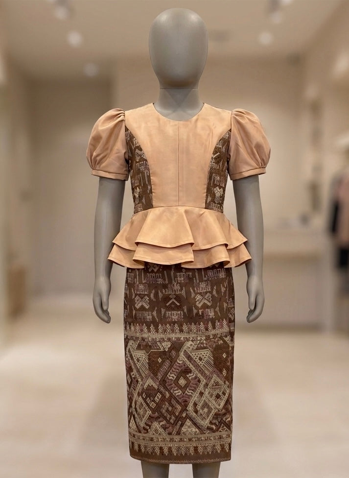 A sweet and timeless Lao set for little ones 🤍 This 2-piece outfit includes a structured blouse and matching sinh, handmade in Laos using a woven silk blend.