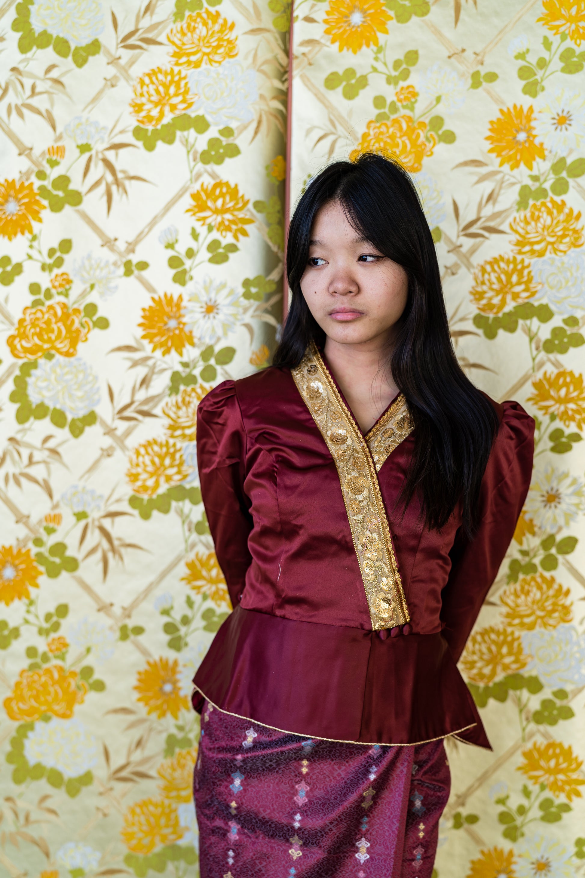 Designed to be worn with a Lao sinh, this top is ideal for temple visits to thuk baht, weddings, baci ceremonies, New Year celebrations, and cultural events. The fabric has a subtle sheen that catches the light beautifully without feeling overly shiny, making it appropriate for both daytime and evening wear.