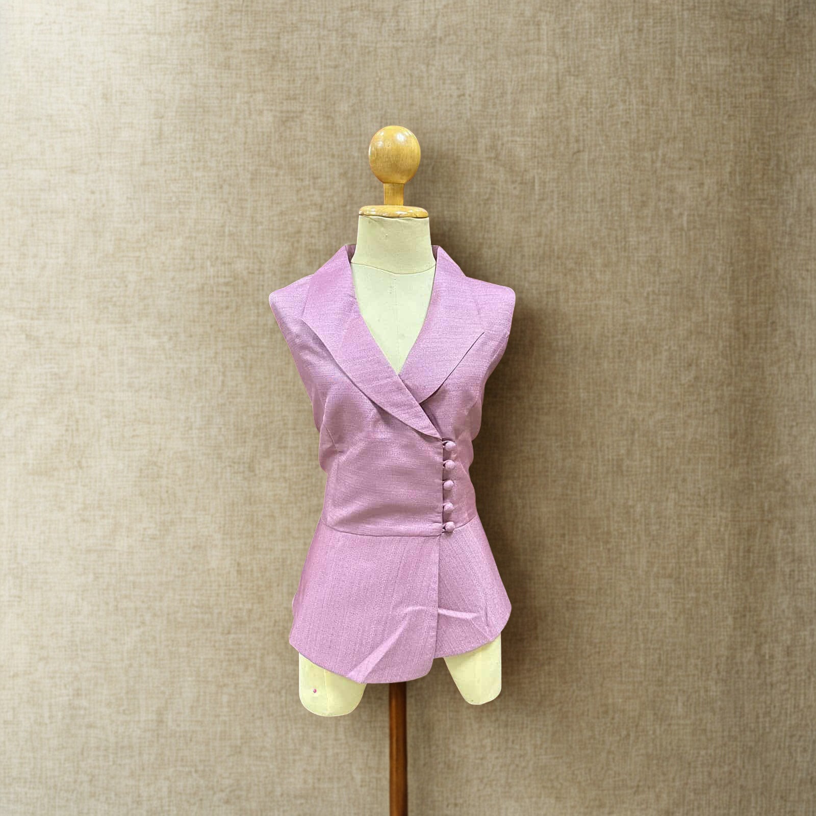 A modern take on traditional tailored Lao shirt often paired with sinhs. Sleeveless and structured with a wrap design and side button details create a flattering silhouette that’s perfect for formal or festive looks. Made from a synthetic blend fabric, these tops have a subtle shimmer and soft texture, giving the look of raw silk without the delicate maintenance.