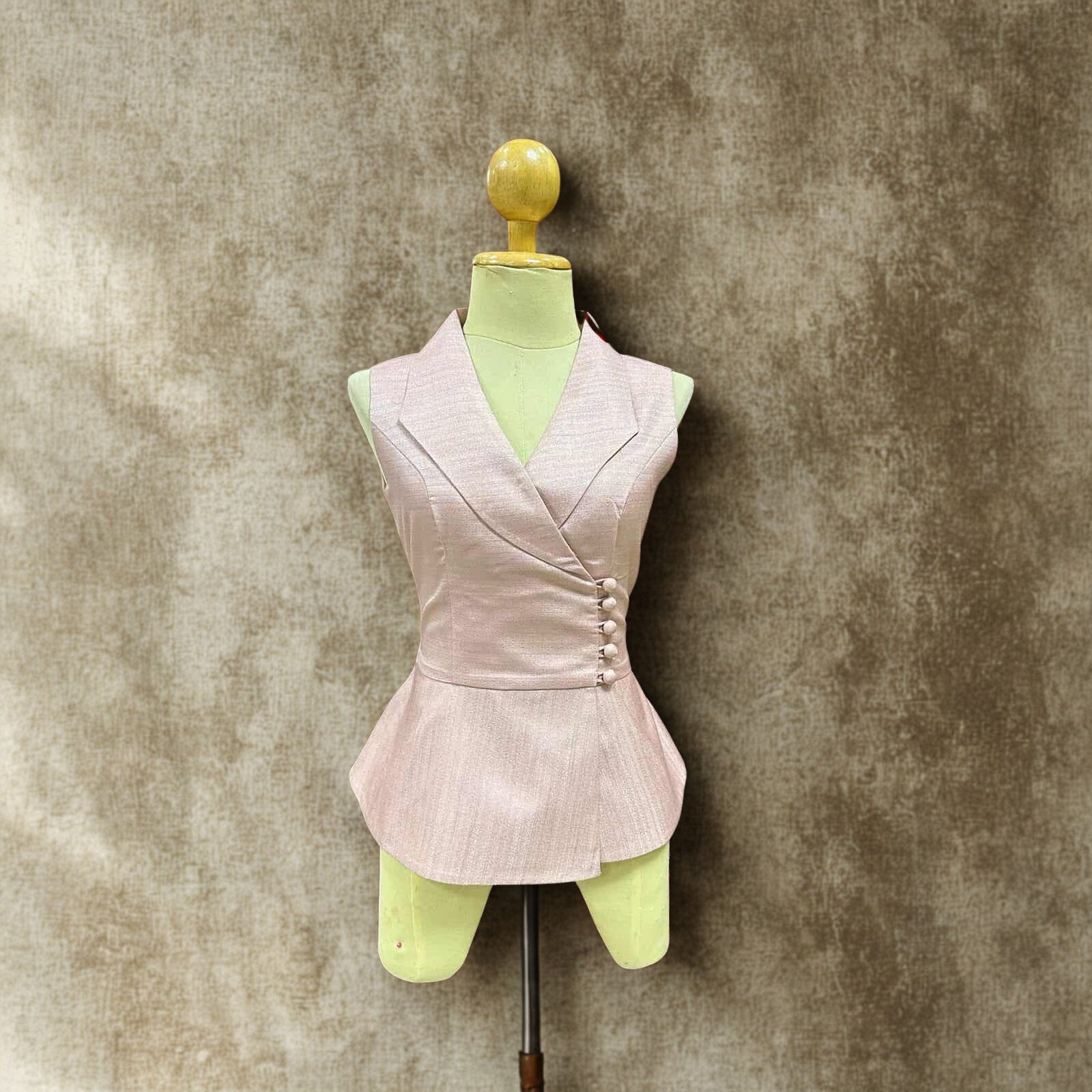 A modern take on traditional tailored Lao shirt often paired with sinhs. Sleeveless and structured with a wrap design and side button details create a flattering silhouette that’s perfect for formal or festive looks. Made from a synthetic blend fabric, these tops have a subtle shimmer and soft texture, giving the look of raw silk without the delicate maintenance.
