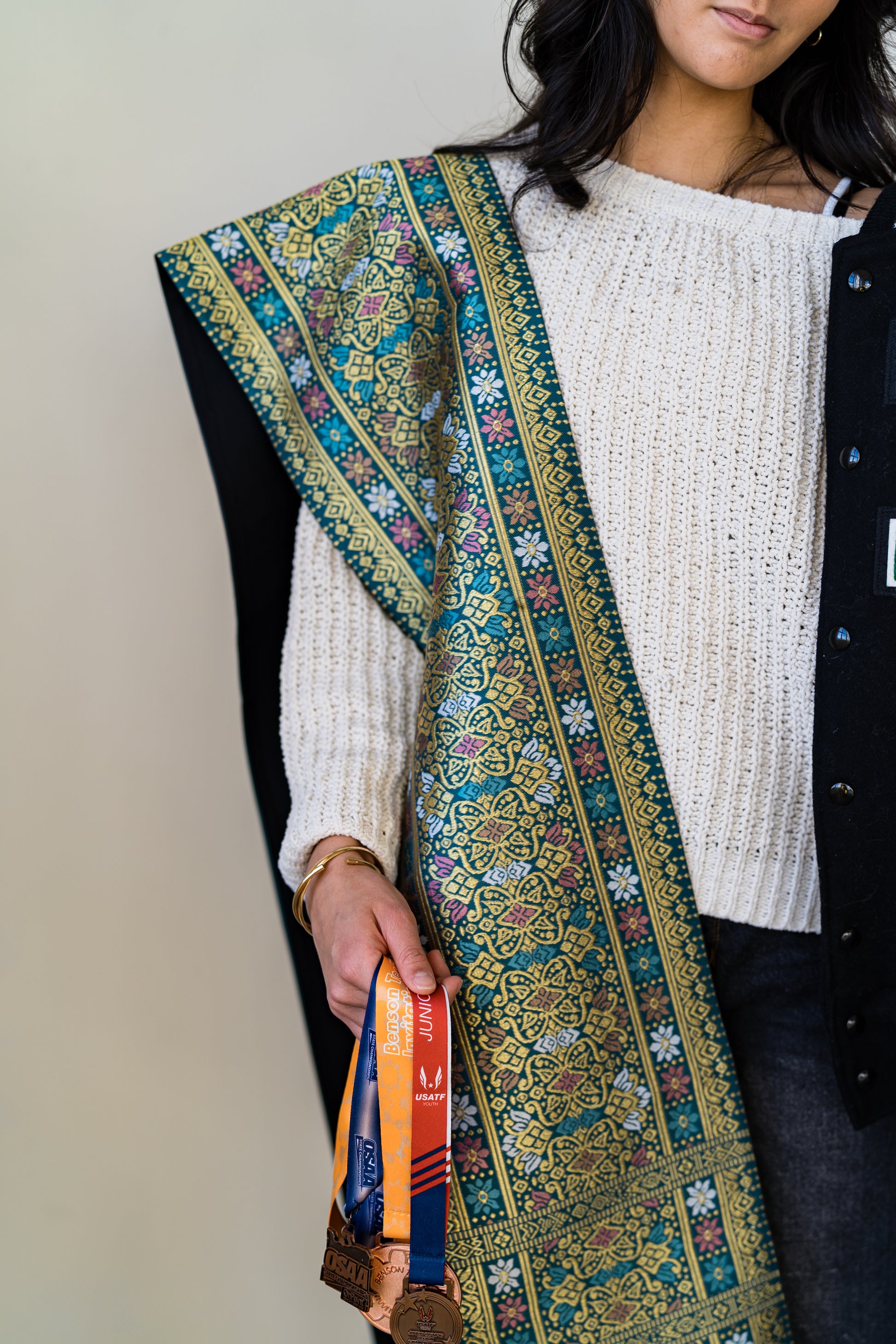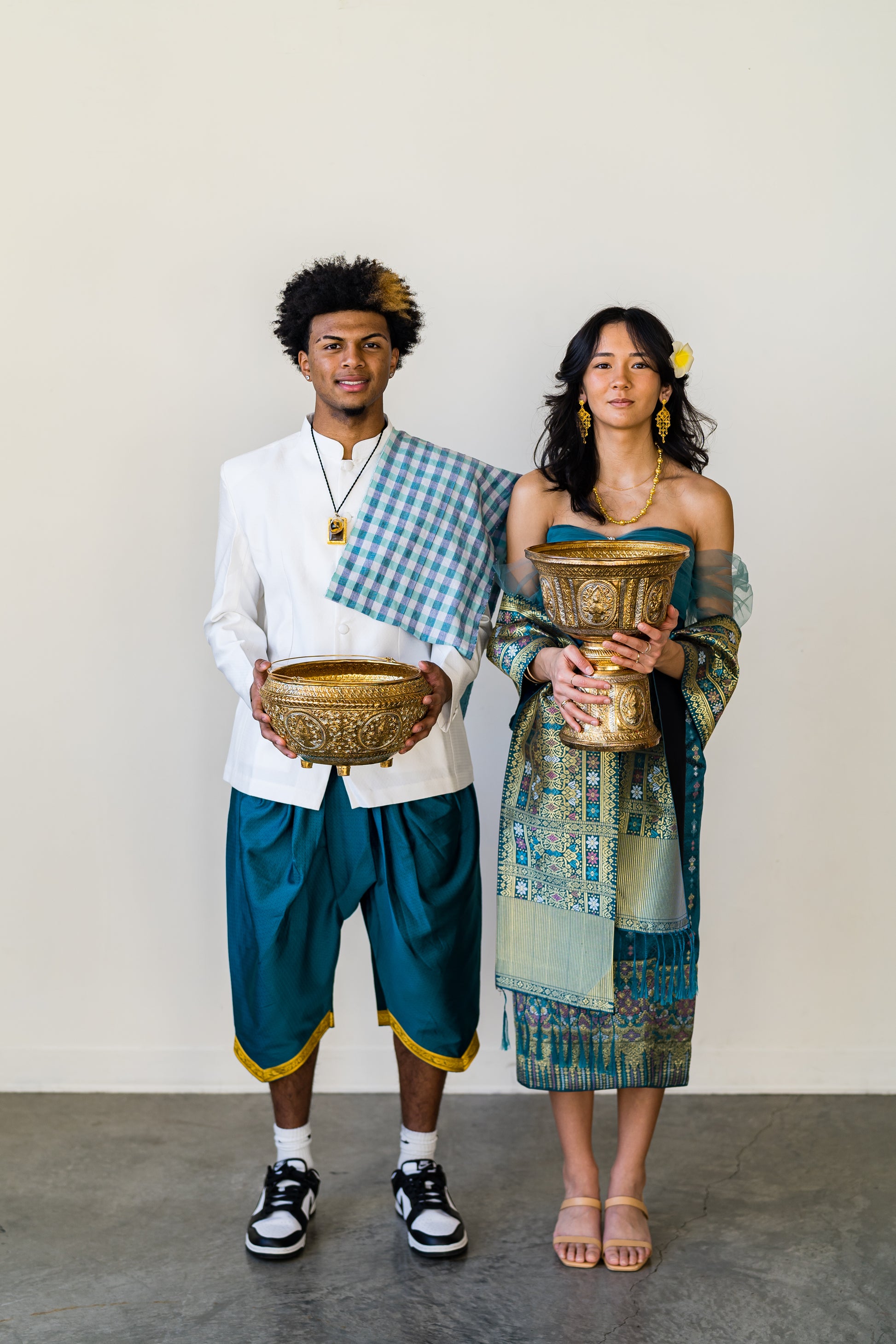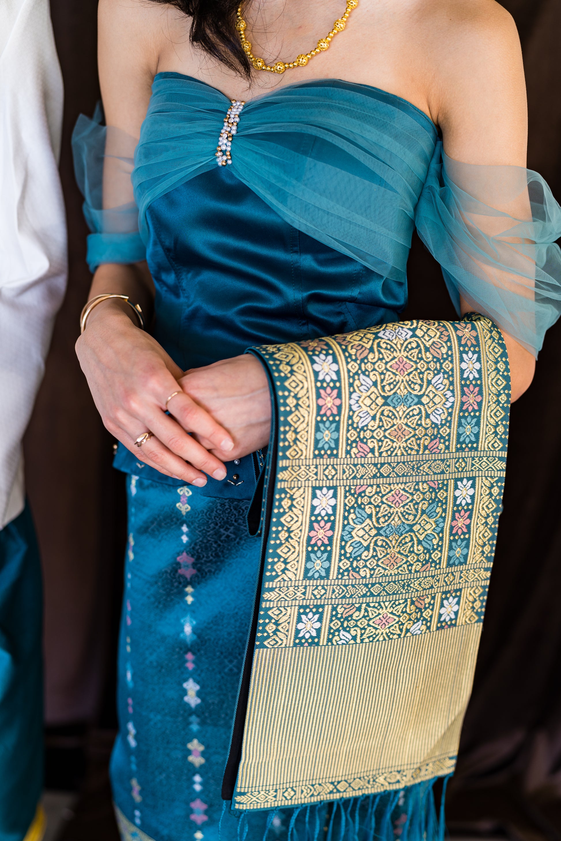 Finish your look with a matching Winter Jewel Pha Biang, created in the same colorway as each sinh. These pieces add the perfect sparkle whether you’re dressing up, layering for photos, or styling a modern Lao fusion outfit.